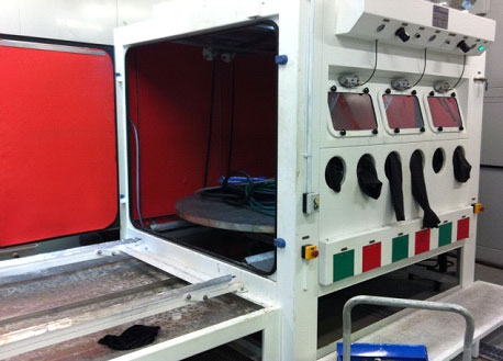 雙工位壓入式噴砂機(jī)—附加自動(dòng)小車帶自動(dòng)轉(zhuǎn)盤,經(jīng)特別改造,融入兩個(gè)工作艙,適合用戶選擇高低工位使用。也適用于較高的零件。前機(jī)艙可讓使用者對(duì)著部件的中下部噴砂,左邊的工作艙工位較高,可讓使用者對(duì)著部件的中上位置噴砂。另外,若需使用該設(shè)備對(duì)起落架的內(nèi)部進(jìn)行拋光處理,可配置垂直移動(dòng)小孔噴槍,工件旋轉(zhuǎn)時(shí),讓噴槍上下移動(dòng),從而獲得均勻的拋光處理效果。